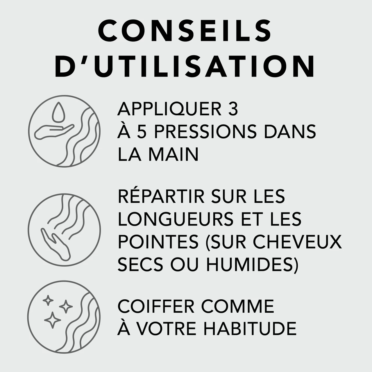 – APPLIQUER 1 Ă 2 gouttes sur cheveux secs ou humides, des mi-longueurs jusquâaux pointes