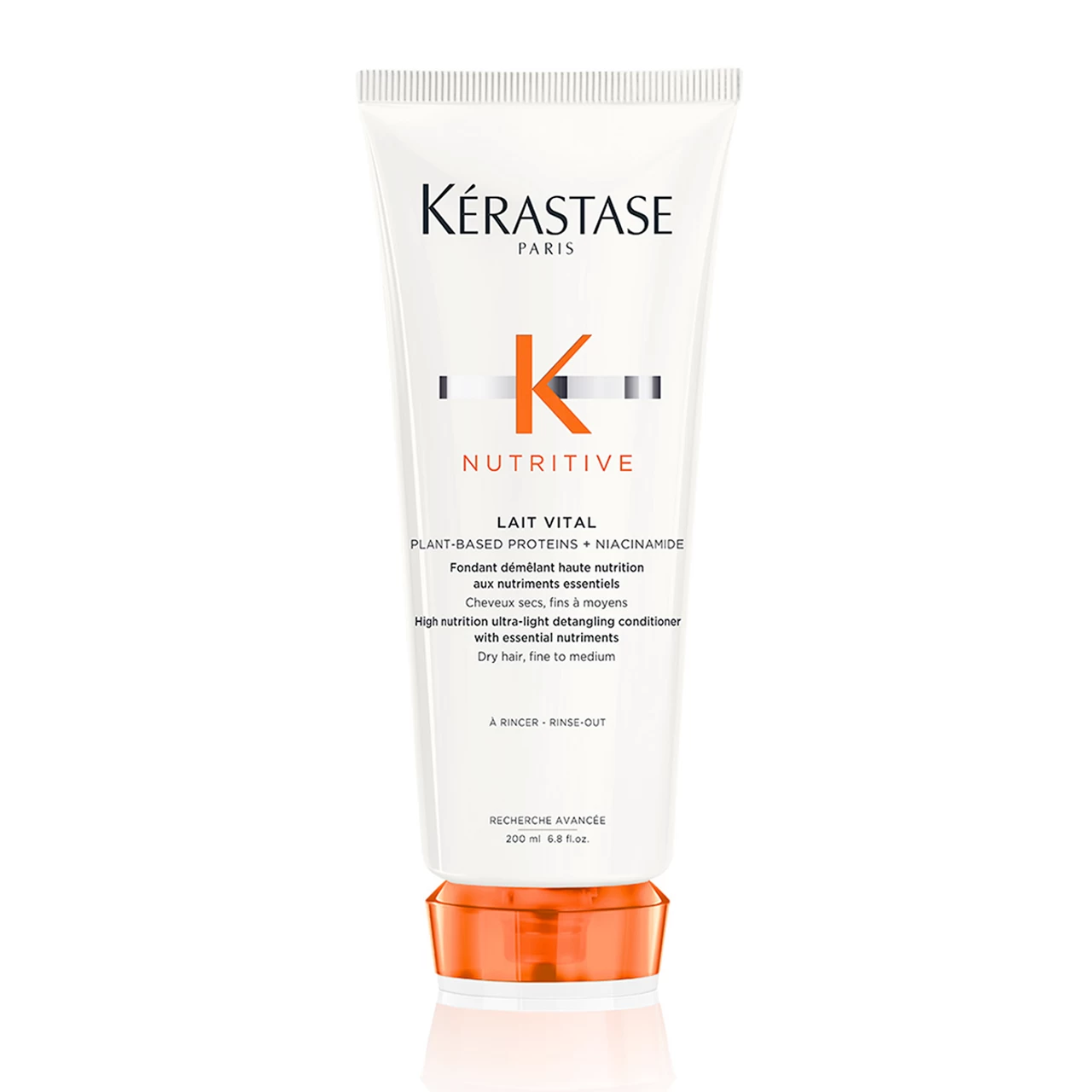 Le Lait Vital de Kérastase est un après-shampoing hydratant, idéal pour les cheveux secs. Sa formule gel nacrée hydrate et démêle les cheveux secs fins à moyens. Enrichi en protéines d’origine végétale et en Niacinamide, un actif issu des soins de la peau qui renforce le cheveu, cet après-shampoing renforce sa barrière protectrice naturelle. En laissant un film qui protège des agressions extérieures, les écailles du cheveu sont lissées, améliorant ainsi significativement la brillance (+116%).