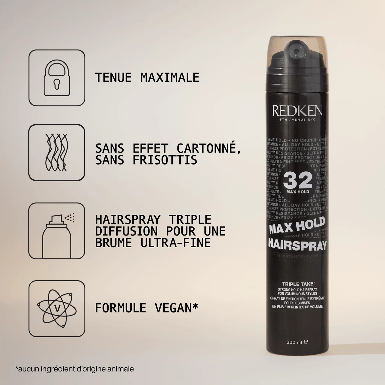 – Spray tenue extrême assurant un contrôle maximal sans effet carton.