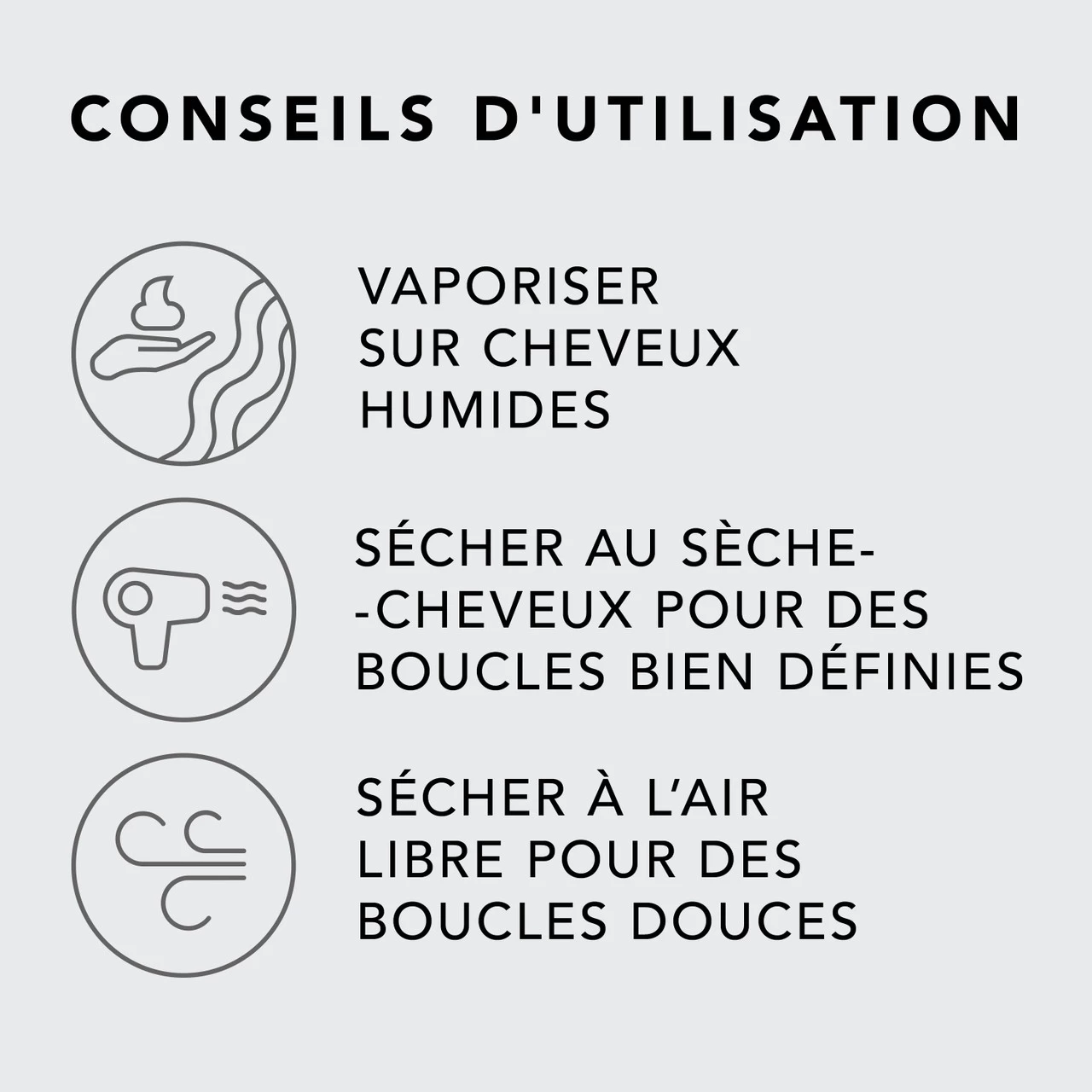 – Séchez à l’air libre pour un mouvement naturel et avec le sèche cheveux pour un rendu encore plus soyeux