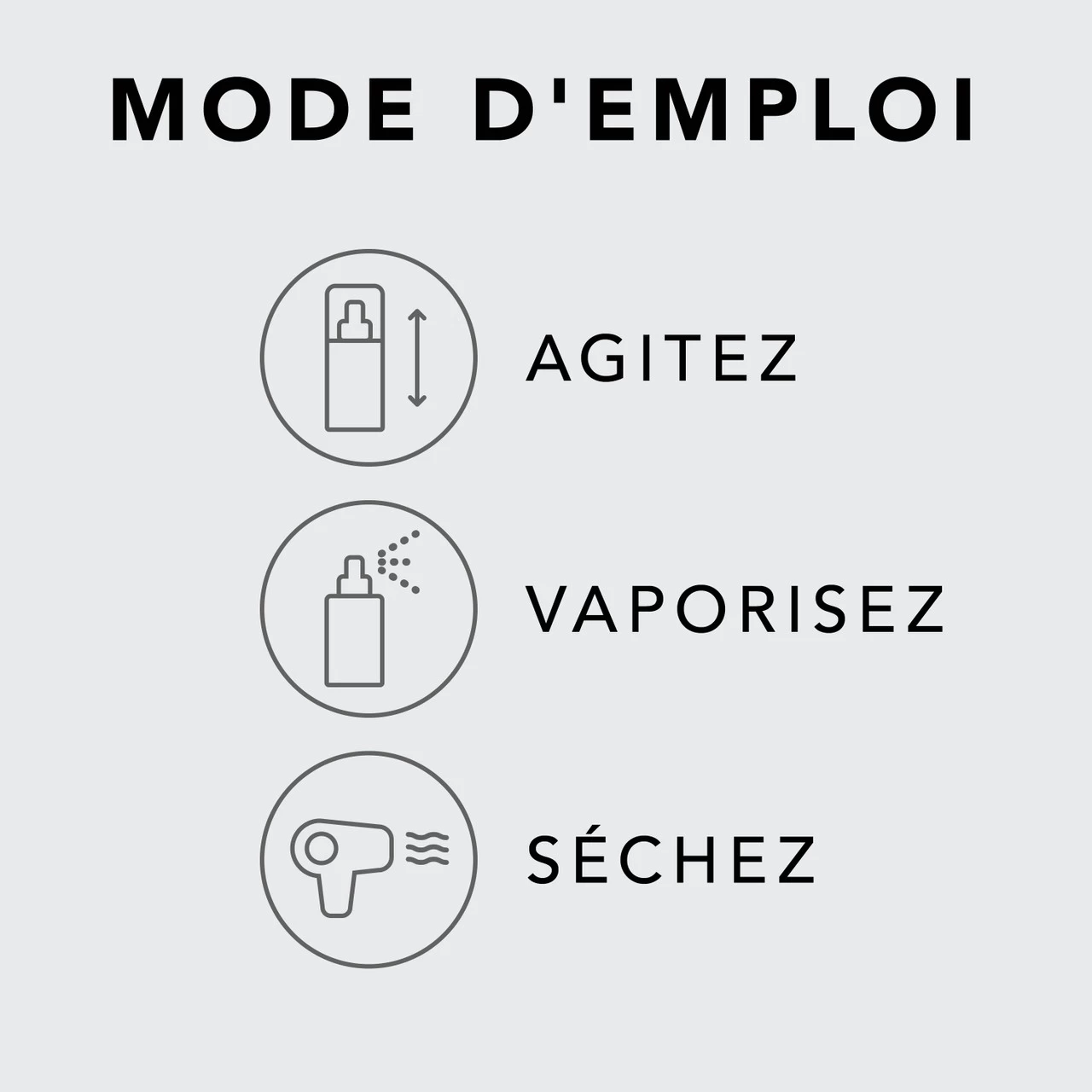 – Vaporisez sur cheveux humides juste avant de les sécher au sèche-cheveux